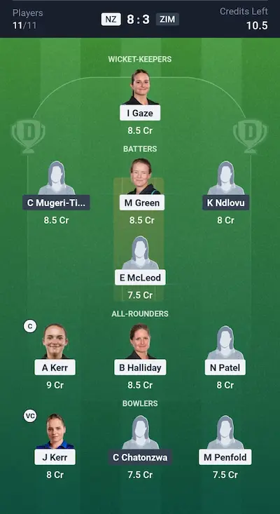 This team is for a scenario where NZ bowls first and Zimbabwe collapses early. Jess Kerr is the captain because she took 3 wickets in the last match. NZ bowlers have been kept in the majority to maximize wicket points.